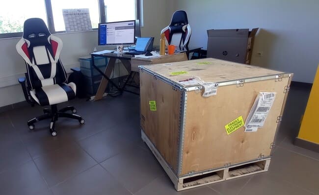 Ce matin, FedEx a livré une belle caisse en bois de 80 cm de côté dans nos locaux de l’hôtel d’entreprises du Grand Figeac…. C’est un peu tard pour les chocolats de Pâques (ou pour une cloche retardataire qui reviendrait de Rome ?), mais cette livraison nous fait bien plaisir quand même !